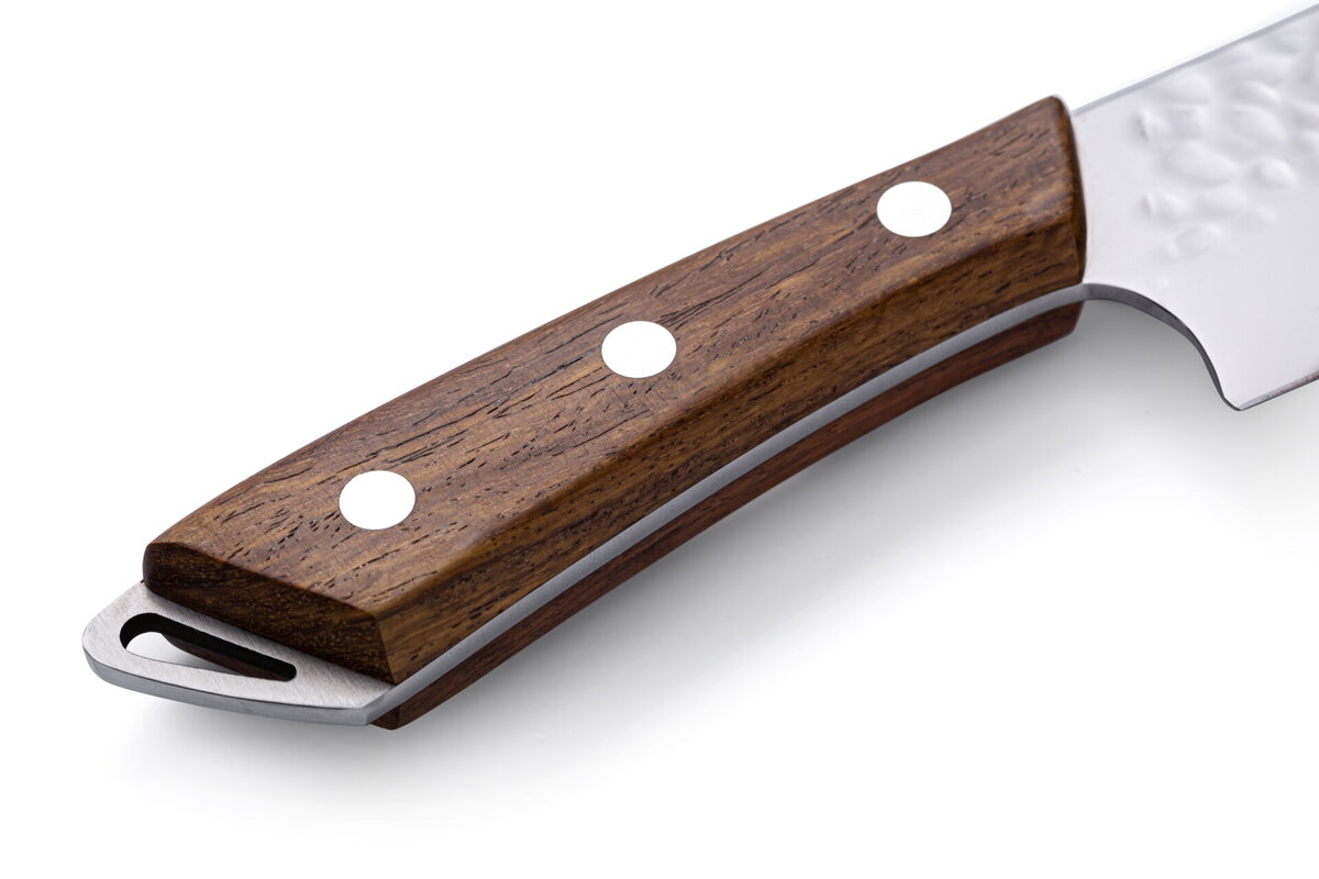 Toto není obyčejný nůž – je to vrchol precizní řemeslné práce. Čepel z japonské oceli AUS8, ručně kovaná a dvakrát finišovaná, je tak ostrá a jedinečná, že každé krájení bude zážitkem. Rukojeť z palisandrového dřeva přináší nejen pohodlí, ale i estetiku, kterou chcete mít ve své kuchyni. Přidali jsme dřevěnou krytku pro bezpečné uložení, protože každý detail záleží. Tento nůž je stvořen pro ty, kteří si cení kvality, elegance a bezkonkurenčního výkonu. Očekávejte dokonalost – nic menšího.